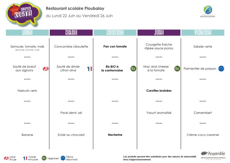 Menu - Sem 26 du 22 au 26 juin