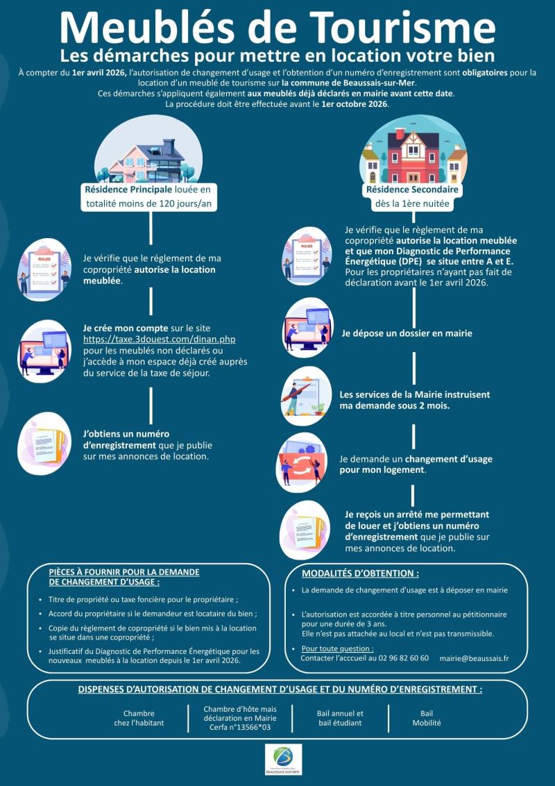Celle-ci est obligatoire, et s’effectue auprès de la Mairie de la commune où est situé le meublé, au moyen du formulaire Cerfa N° 14004*04. Le formulaire doit être dûment complété et transmis à la Mairie, soit sur place, par voie postale ou par voie électronique (mairie@beaussais.fr)