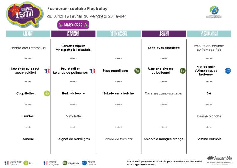 Menu semaine 08 - 16 au 20 février