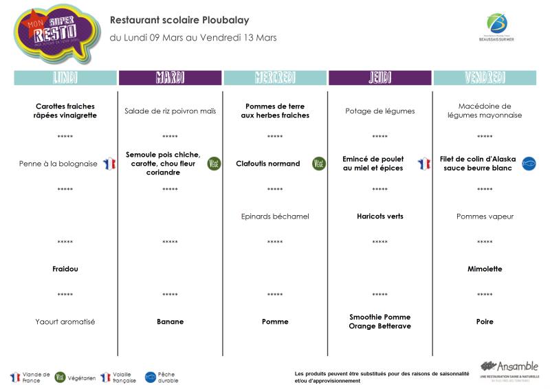 Menu semaine 11 - 9 au 13 mars