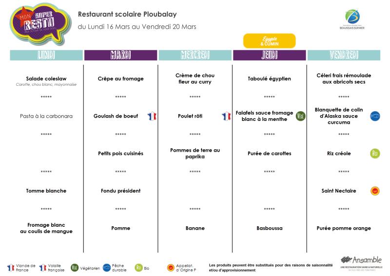 Menu semaine 13 - 23 au 27 mars