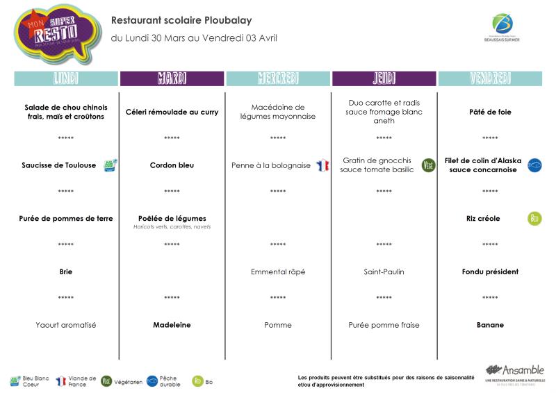 Menu semaine 14 - 30 mars au 3 avril